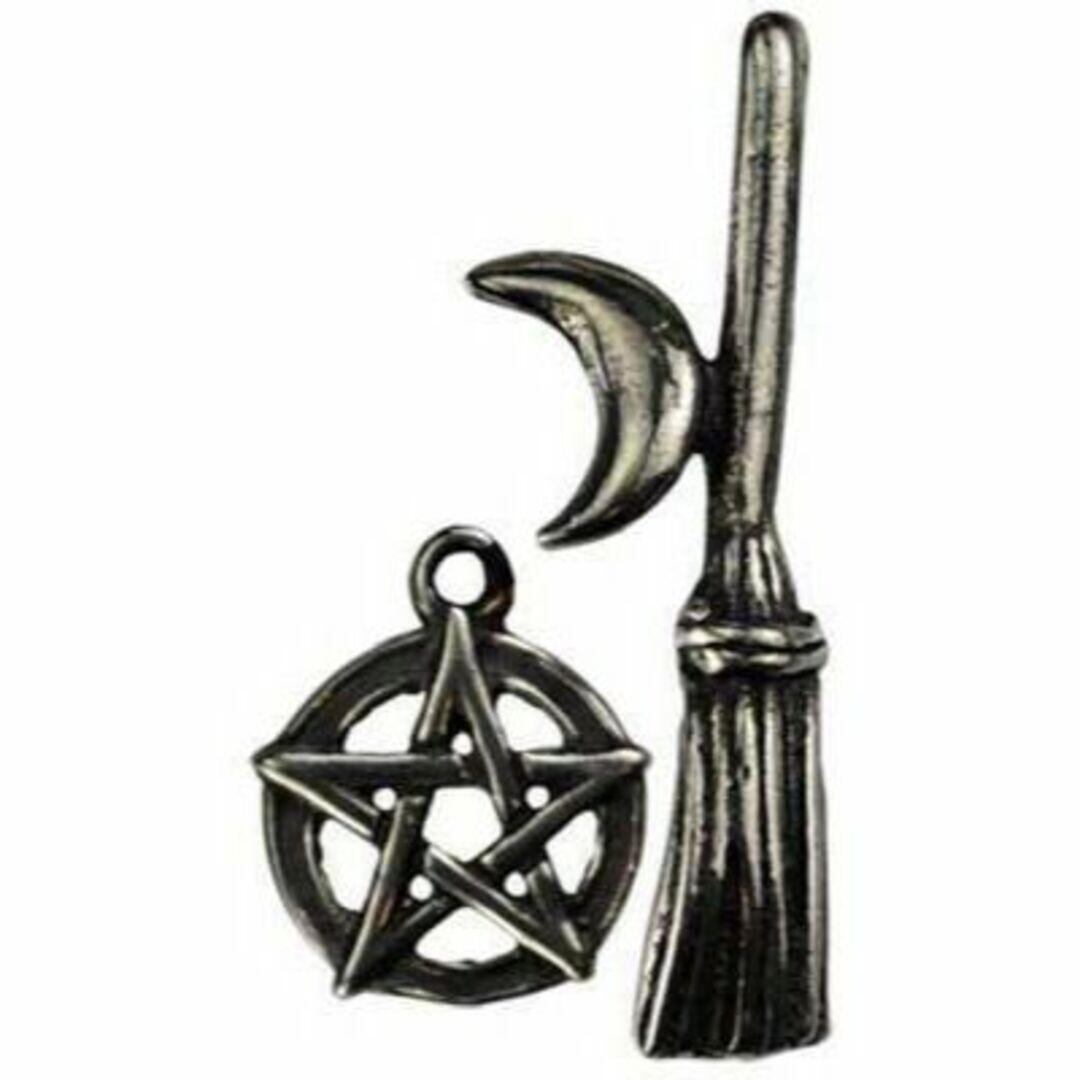 三日月魔女のほうきと小さな五芒星が描かれたピューターのお守りペア。両方のチャームが付属しています。AAWWITB