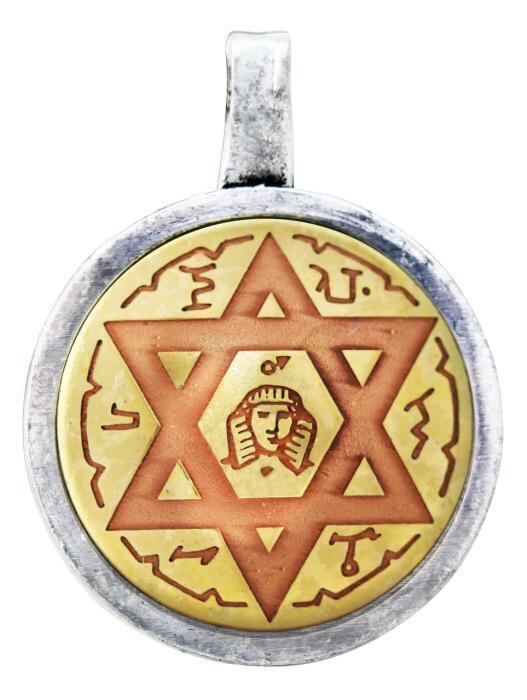 ダビデの星とスフィンクスは、伝統的に若々しさと活力を引き付けるこの太陽のお守りに登場します。