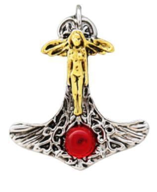 このペンダントは、北欧神話の雷神**トール(Þórr)**が持つ強力な武器、**ミョルニル(Mjölnir)**をモチーフにしたデザインです。中央には女性像が配置され、赤い宝石が装飾されています。