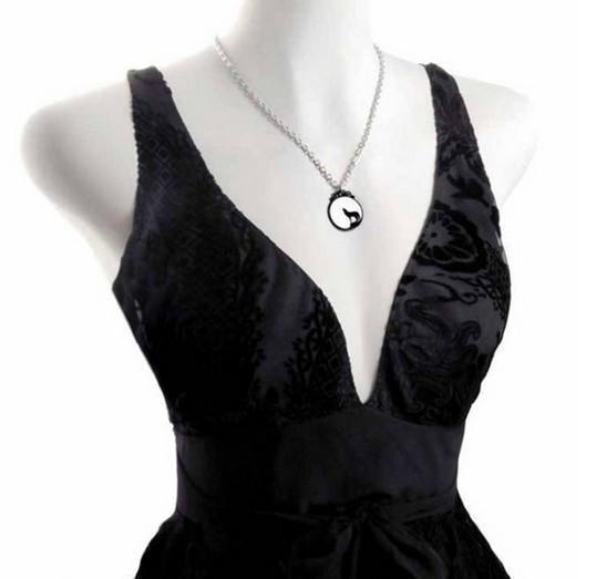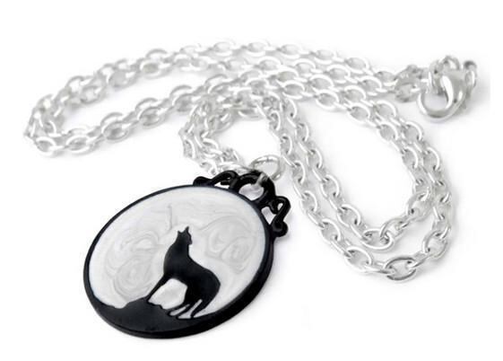 月明かりに照らされた森の中、月に向かって泣く身も凍るような孤独に嘆くウルフの姿。ALCHEMY GOTHICから贈られたこのウルフのペンダントは、真珠のような光沢を放つ白いエナメルが施された黒いピューターで作られています。