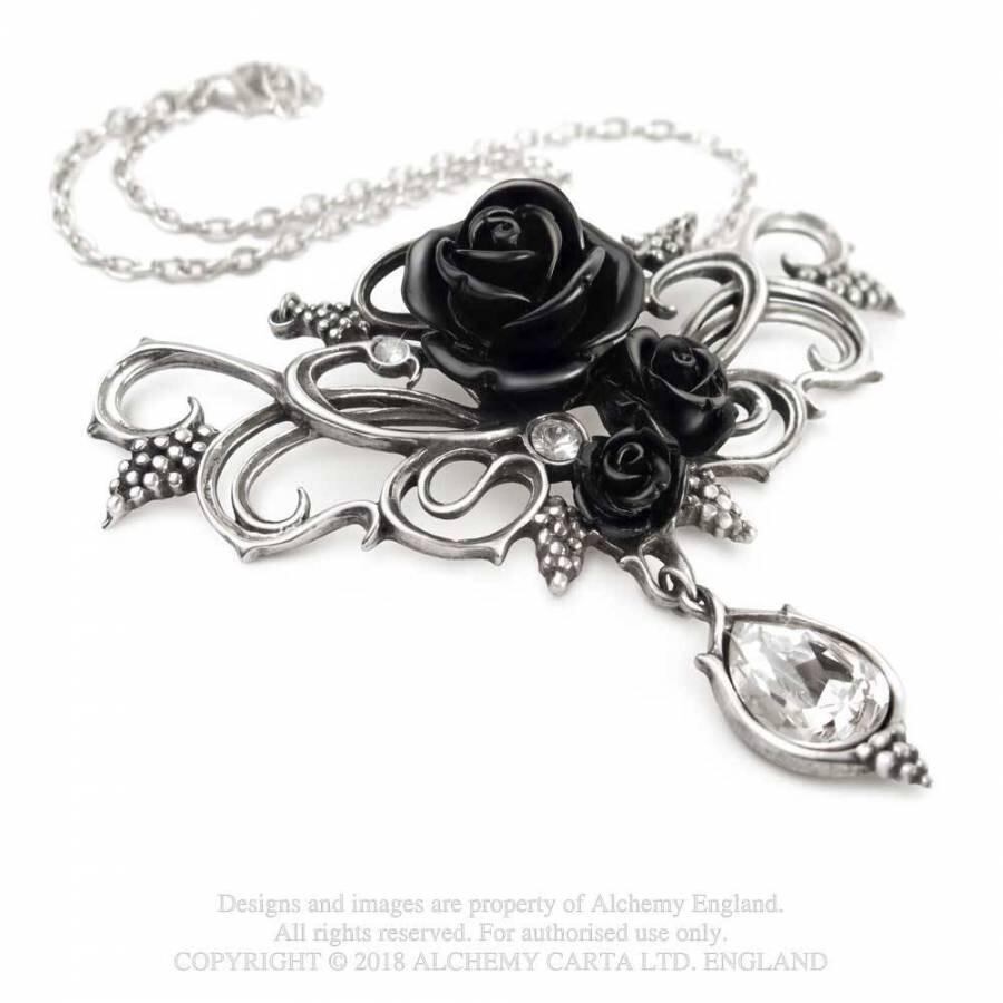 3 本の黒い樹脂のバラを囲み、絡み合ったブドウの蔓が華やかなピューターのネックレスで、オーストリア製の透明なクリスタルの涙滴で吊り下げられています。