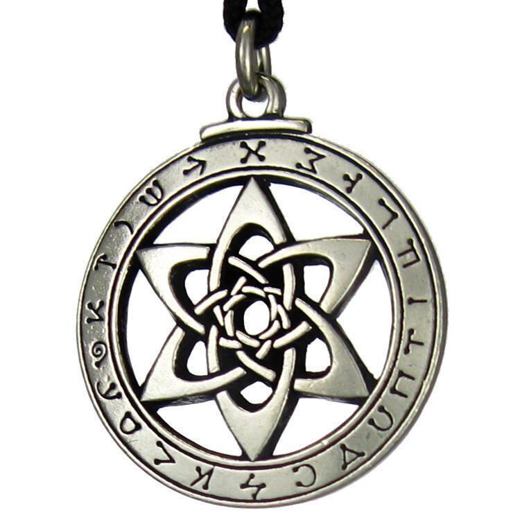 この文字は星座に由来しており、高位のフリーメイソンリーで今でも使用されている秘密のアルファベットです。ケルト風のヘキサグラムの周囲に記されている文字は、星の配置に由来するといわれています。着用者に天上の奇跡と力をもたらすことでしょう。