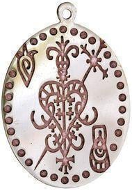 このペンダントに描かれている複雑なシンボルは、ブードゥー教において「ヴェヴェ(Veve)」と呼ばれる、特定のロア(精霊)を召喚したり、その力を活性化させたりするために描かれる図像の一部である可能性が高いです。ヴェヴェは、ロアのエネルギーを集中させ、儀式の場を聖別する役割を果たします。
