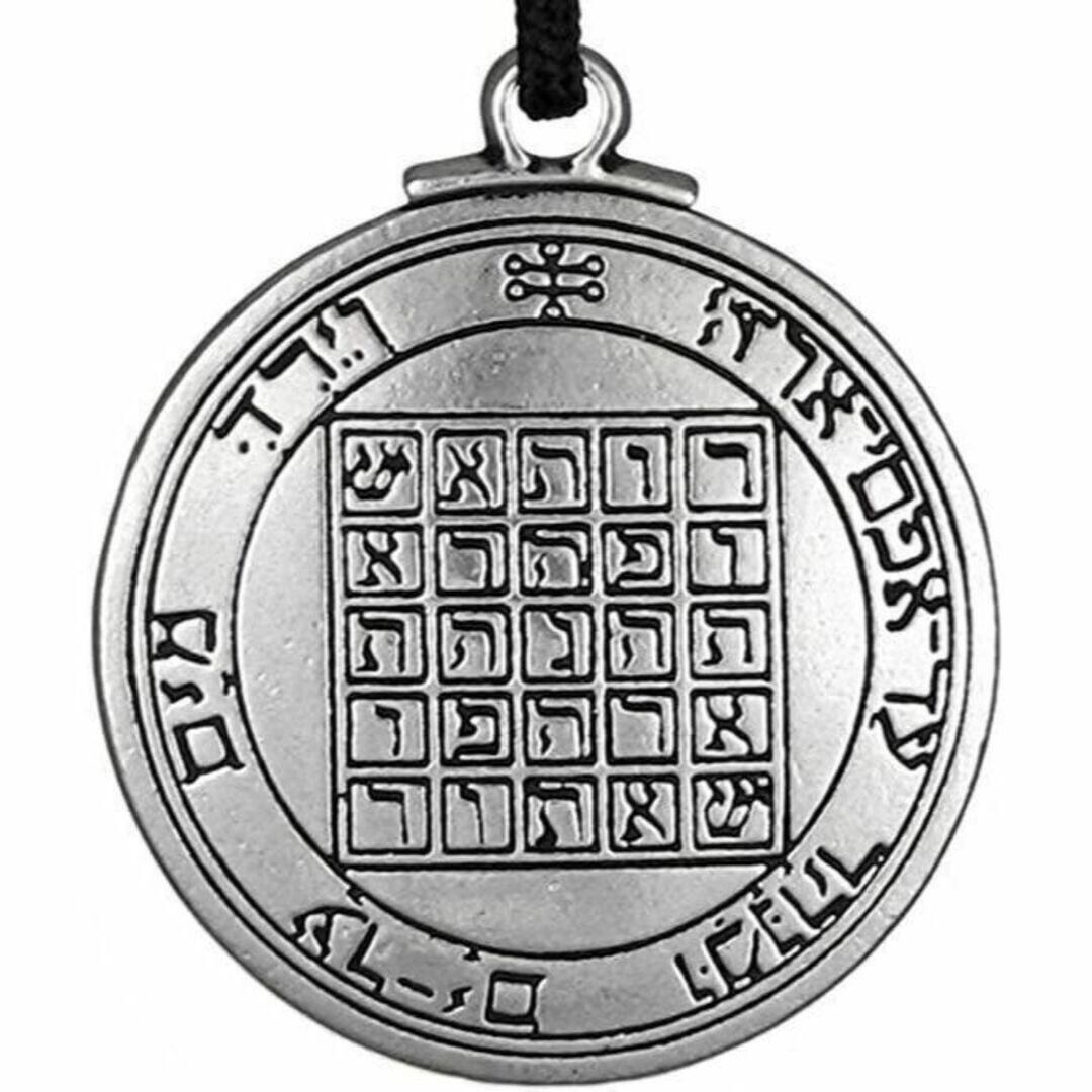 このペンダントに描かれているシンボルや文字は、伝統的な魔術書であるグリモワール、特に**ソロモンの鍵(Key of Solomon)**に由来する「惑星の護符(Planetary Talismans)」の一つである可能性が高いです。ソロモンの鍵には、各惑星に対応する護符が記されており、それぞれ異なる魔術的な目的のために用いられます。