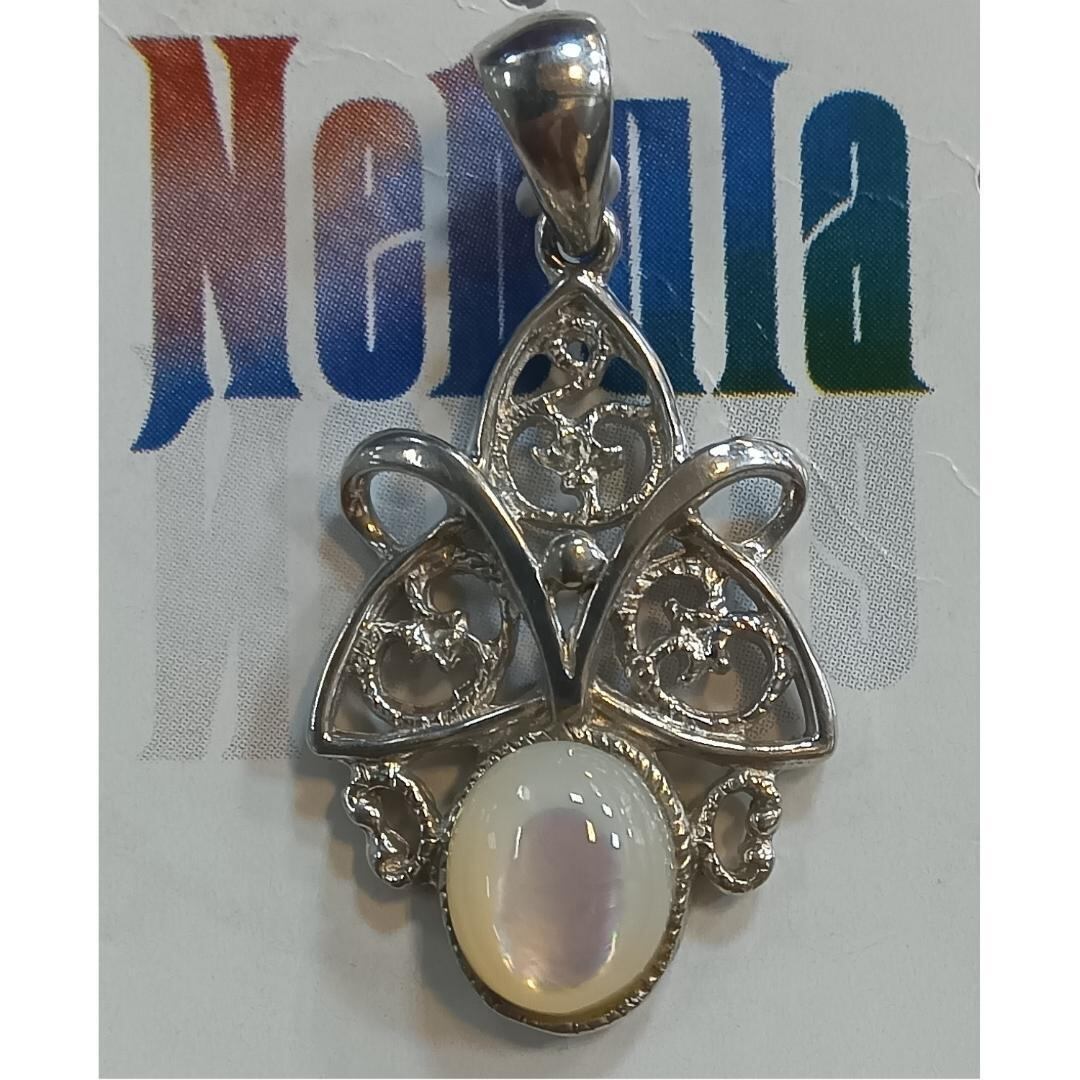 このペンダントは、その洗練された装飾と神秘的な宝石の組み合わせから、自然の美しさ、精神的な調和、内なる知恵、そして保護といった意味合いを持つと考えられます。