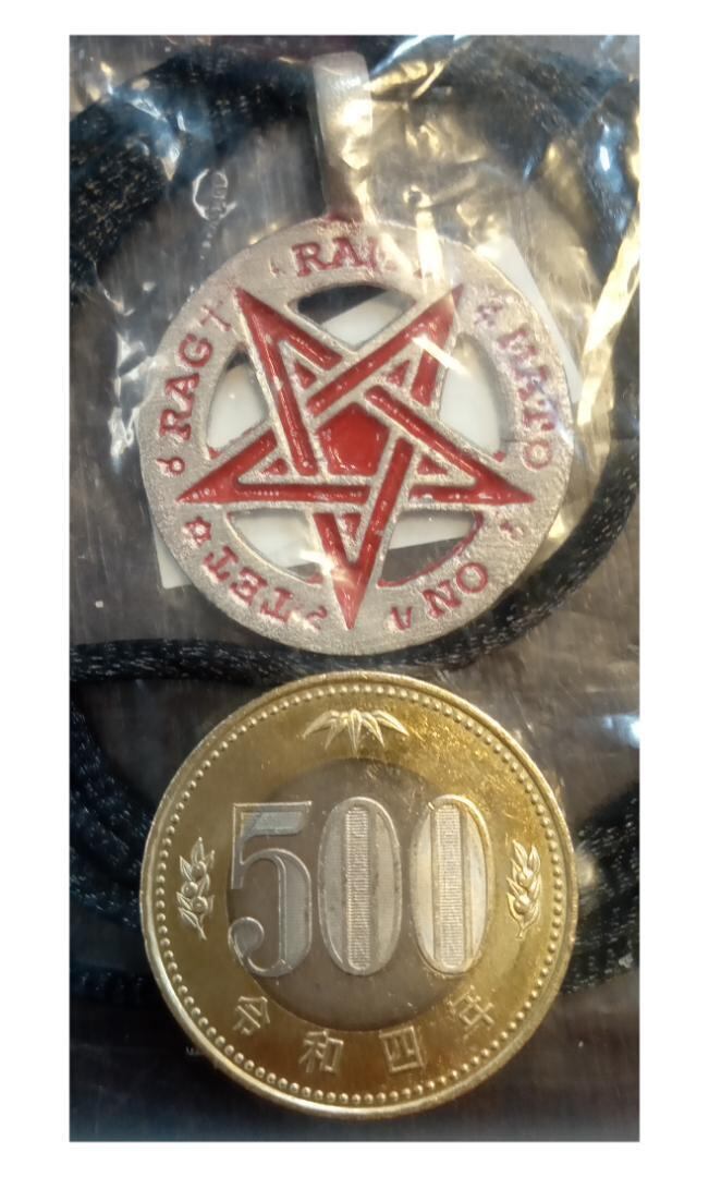 赤い逆五芒星(インバーテッド・ペンタグラム)が中央に配置され、周囲に文字が刻まれていることから、特定の神秘主義的、あるいはオカルト的な文脈における「神聖な保護」の意味合いを持つと考えられます。