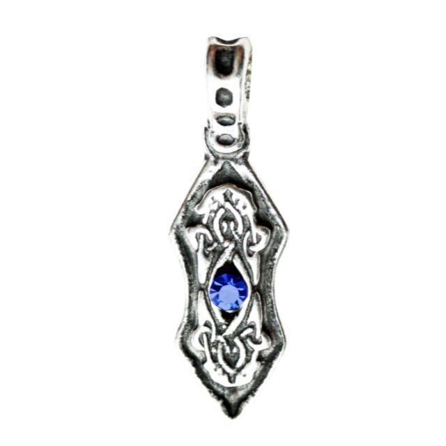 セルティックまたは北欧の芸術的伝統を連想させる複雑な結び目を特徴としており、中央のファセットの明るい青い宝石を組み立てています。この青い宝石は、ペンダントの焦点です。上部には、チェーンまたはコードをねじ込むための統合保釈(ループ)があります。金属にはわずかに骨が刻まれたまたはテクスチャの仕上げがあり、結び目の詳細が向上します。