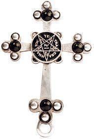 キリスト教の象徴である「十字架」と、西洋魔術やオカルティズムにおいて重要な「五芒星(ペンタグラム)」、そして神の名を指す「テトラグラマトン」を組み合わせた、非常に象徴的で複雑な意味を持つアイテムです。