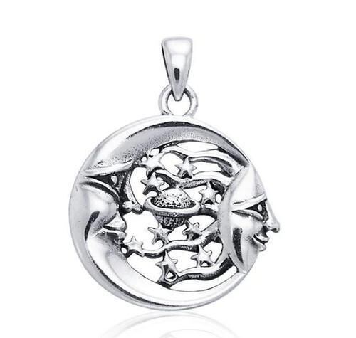 「Celestial Journeys Pendant」(天体の旅のペンダント)と名付けられた、非常に象徴的な意味を持つペンダントです。このペンダントは、太陽と月が向かい合い、その間に惑星や星が描かれているデザインで、占星術や神秘主義的な世界観を表現しています。