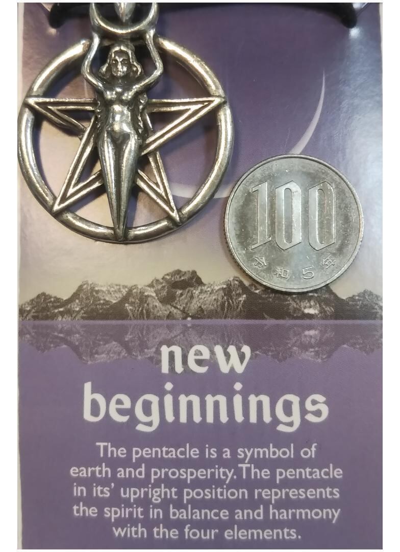 五芒星(ペンタグラム)の中心に、女神が両手を挙げて月を受け止めているかのような姿が描かれたペンダントです。これは、ウイッカや新異教主義における重要なシンボルを組み合わせた、非常に象徴的な意味を持つアイテムです。