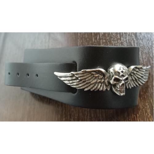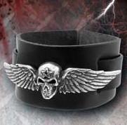 このブレスレットは、フライング・スカル(翼を持つ髑髏)というゴシック文化の象徴的なモチーフを特徴としています。