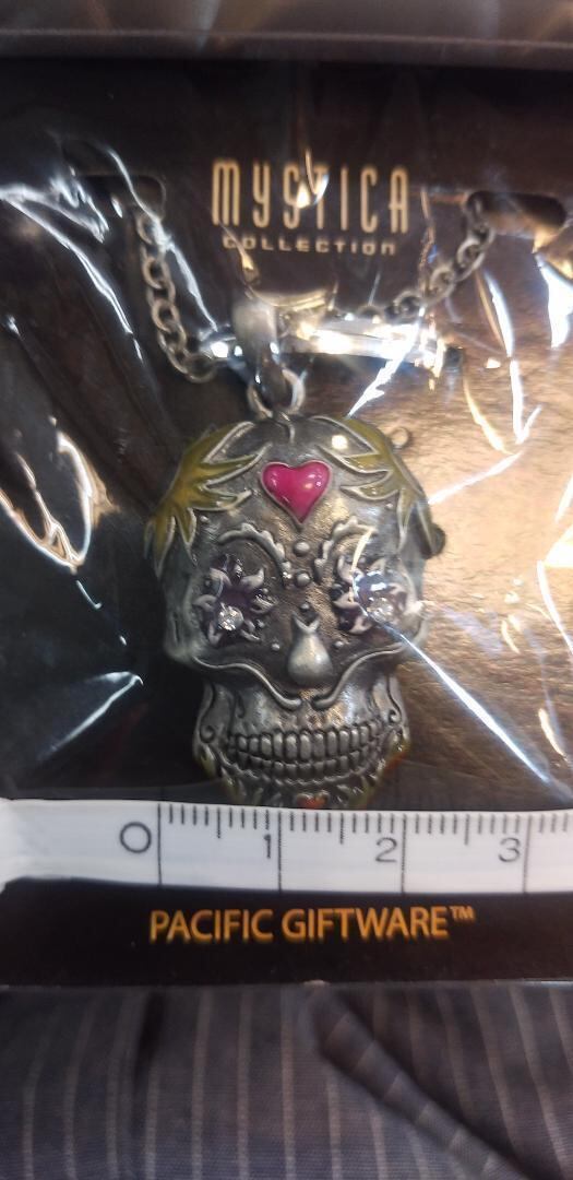 これはカラベラの頭蓋骨をモデルにした素晴らしい死者の日のスカルペンダントで、18インチのチェーンが付いています。上質なピューター、さまざまな色の人造宝石。 1 1/4インチ×3/4インチ