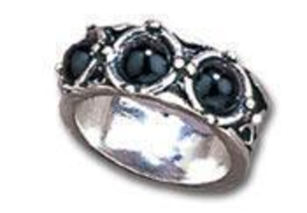3 つのブラック カボションがはめ込まれた美しい彫刻が施されたリング。