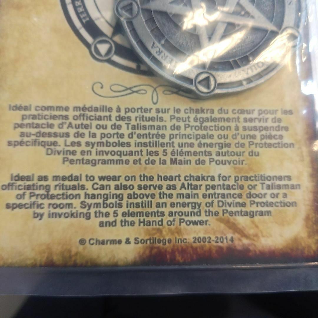 魔術儀式の際、このペンダントをアナーハタ・チャクラ(ハート・チャクラ―胸の部分)の上に身につけるのが理想です。同時に、建物や部屋の入り口にもペンタクルや保護のタリスマンをかけておくと良いでしょう。すべての元素をもれなくタリスマンとあなた自身にもたらし、神の保護を得ることができるでしょう。直径約6cmと、やや大きめのサイズです。