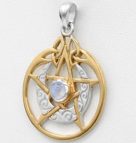 Sterling Silver Vermeil Crescent Moon Pentacle Pendant with Circle and White Moonstone tpv1608-ms