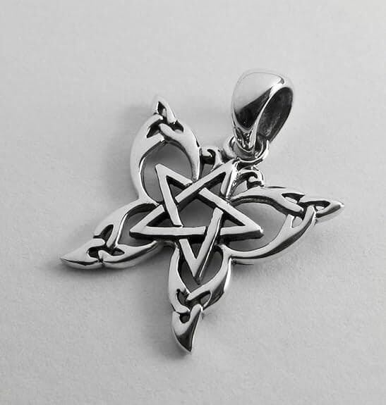 **蝶(バタフライ)と五芒星(ペンタグラム/ペンタクル)**をケルトの結び目(ノットワーク)のようなデザインで組み合わせたものであり、変容と保護という強力なテーマを持つ護符です。