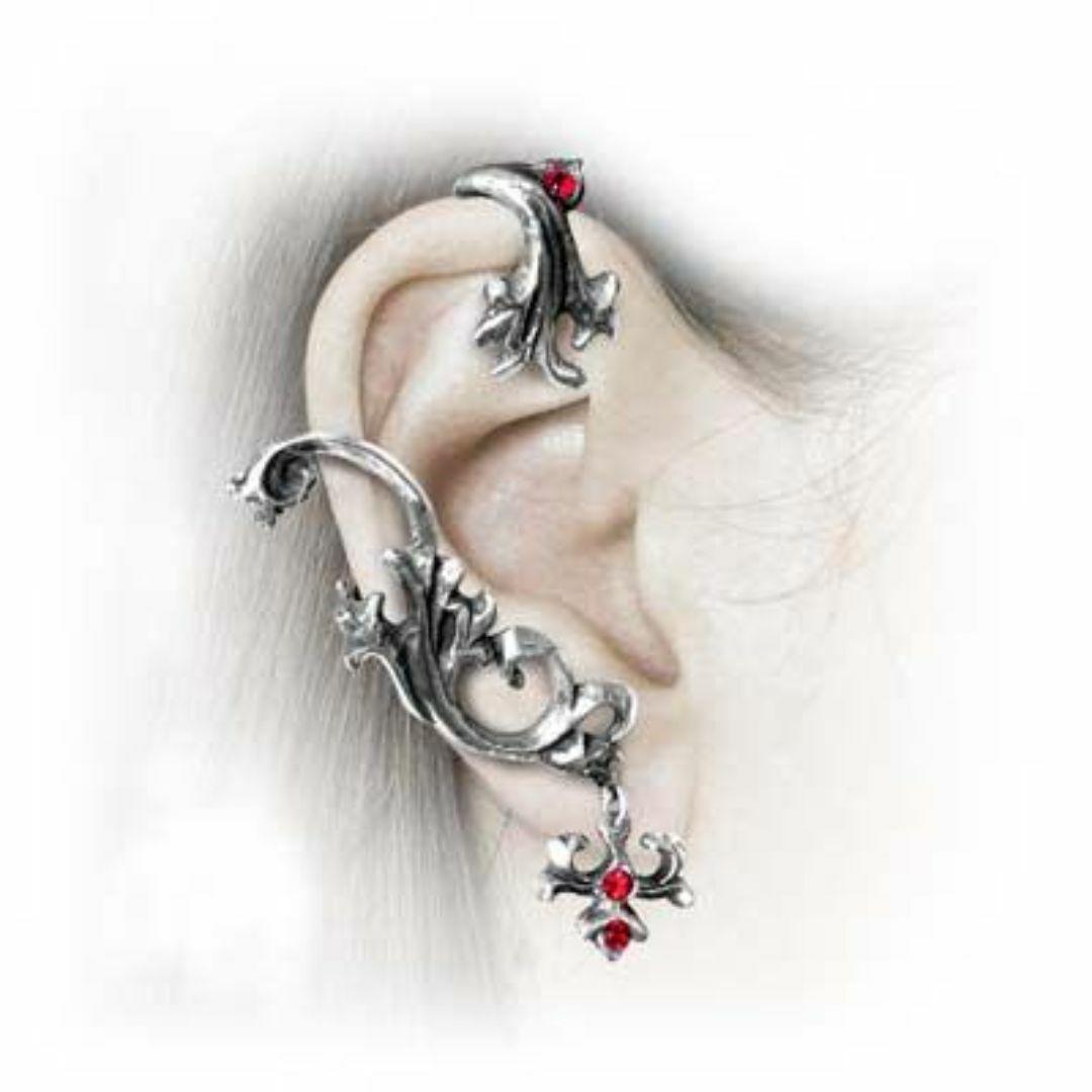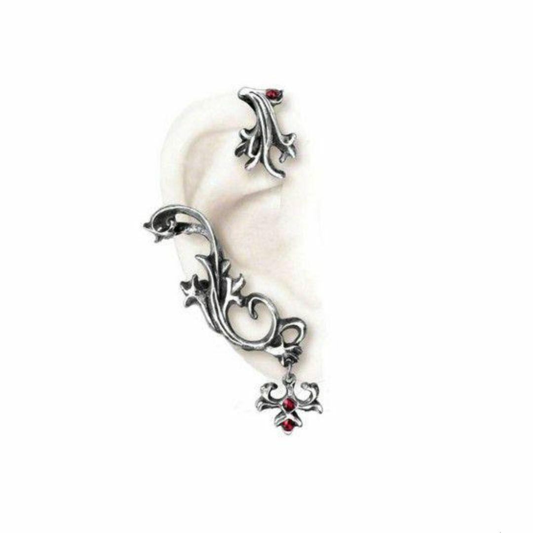 ローマ神話では、シルバヌスは森の精霊の神です。華麗なバロック様式でねじれスクロールする花の耳カバーは、耳の上部に引っ掛けられた別のセクションにチェーンで支えられています。多くの賛辞を得るユニークで華やかな耳飾り。スワロフスキー クリスタルとサージカル スチール製のイヤーポストをあしらったバロック様式の華麗なピューター イヤーラップ。