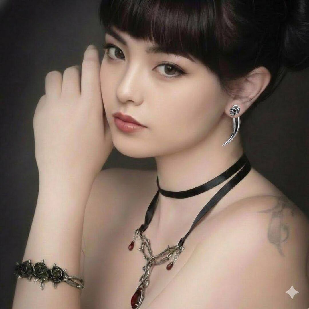 漆黒の髪と静謐な表情を持つ彼女がこのピアスを纏うことで、その横顔には「知的な静けさ」と「抗いがたい野性味」が同時に宿り、見る者に強烈な印象を与えます。