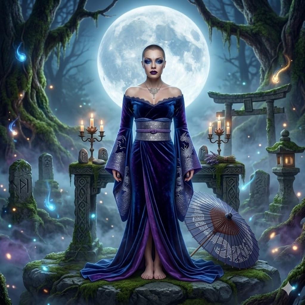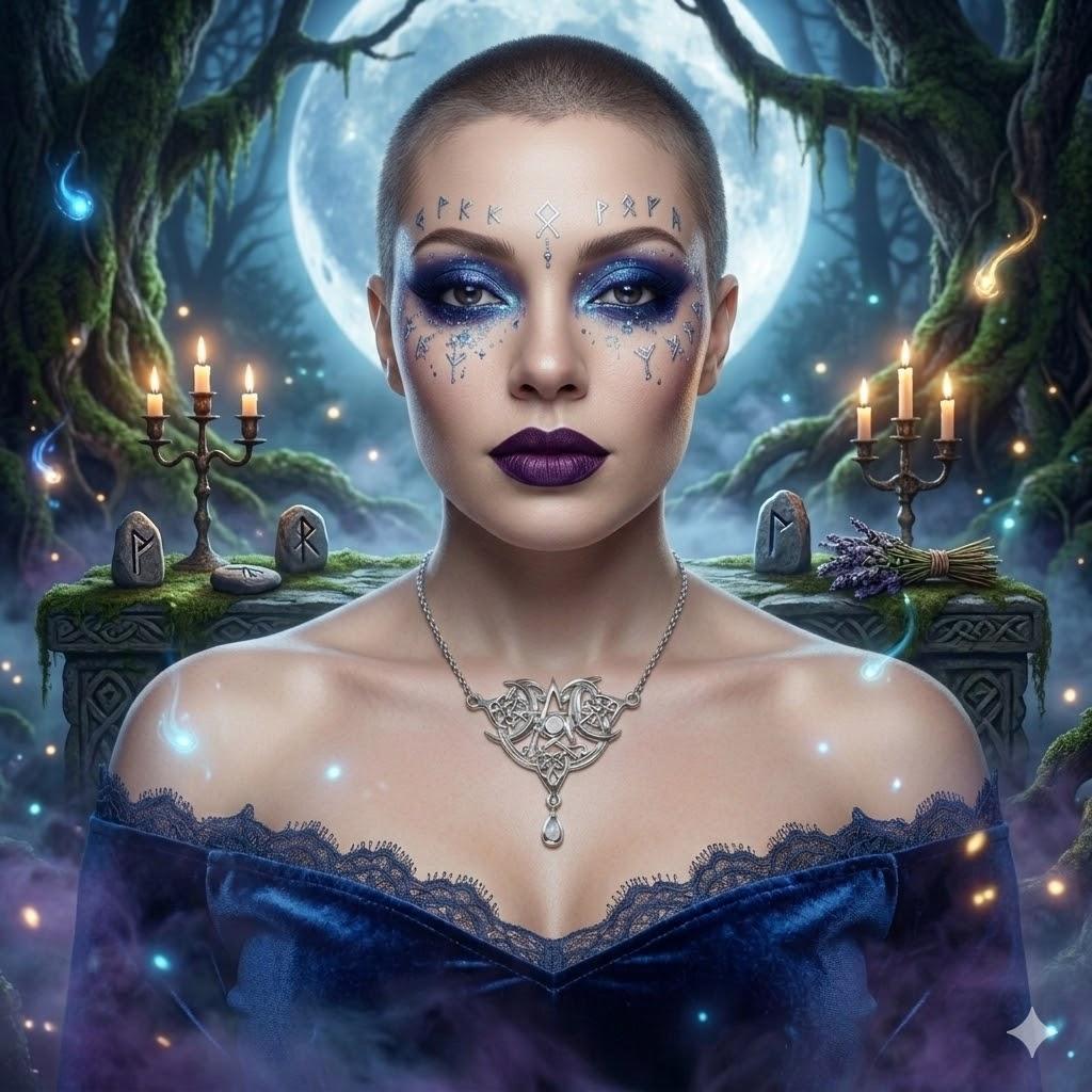左右の三日月と中央の満月は、女性の生涯(処女・母・老婆)と月の満ち欠けをなぞらえた「三相女神」の象徴。若さ、豊穣、そして知恵という生命のサイクルと聖なる女性性を表しています。