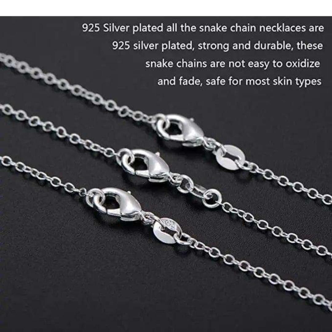 こちらは、925シルバープレートの上品なスネークチェーンネックレスです。シンプルながらも洗練されたデザインは、日常使いから特別な日まで、様々なシーンで活躍します。お手持ちのペンダントトップと合わせたり、他のネックレスとの重ね付け(レイヤードスタイル)もお楽しみいただけます。
