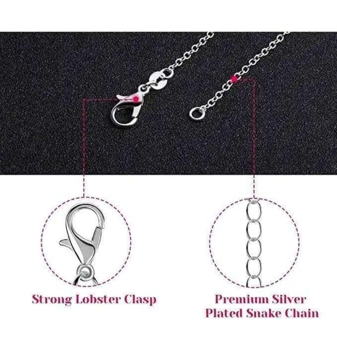素材は925シルバープレート加工が施されており、丈夫で変色しにくい特性があります。長くご愛用いただける品質です。また、肌に優しい素材で作られているため、多くの方に安心してご着用いただけます。留め具は、しっかりと固定できるロブスタークラスプ(カニカン)を採用しており、着脱もスムーズです。