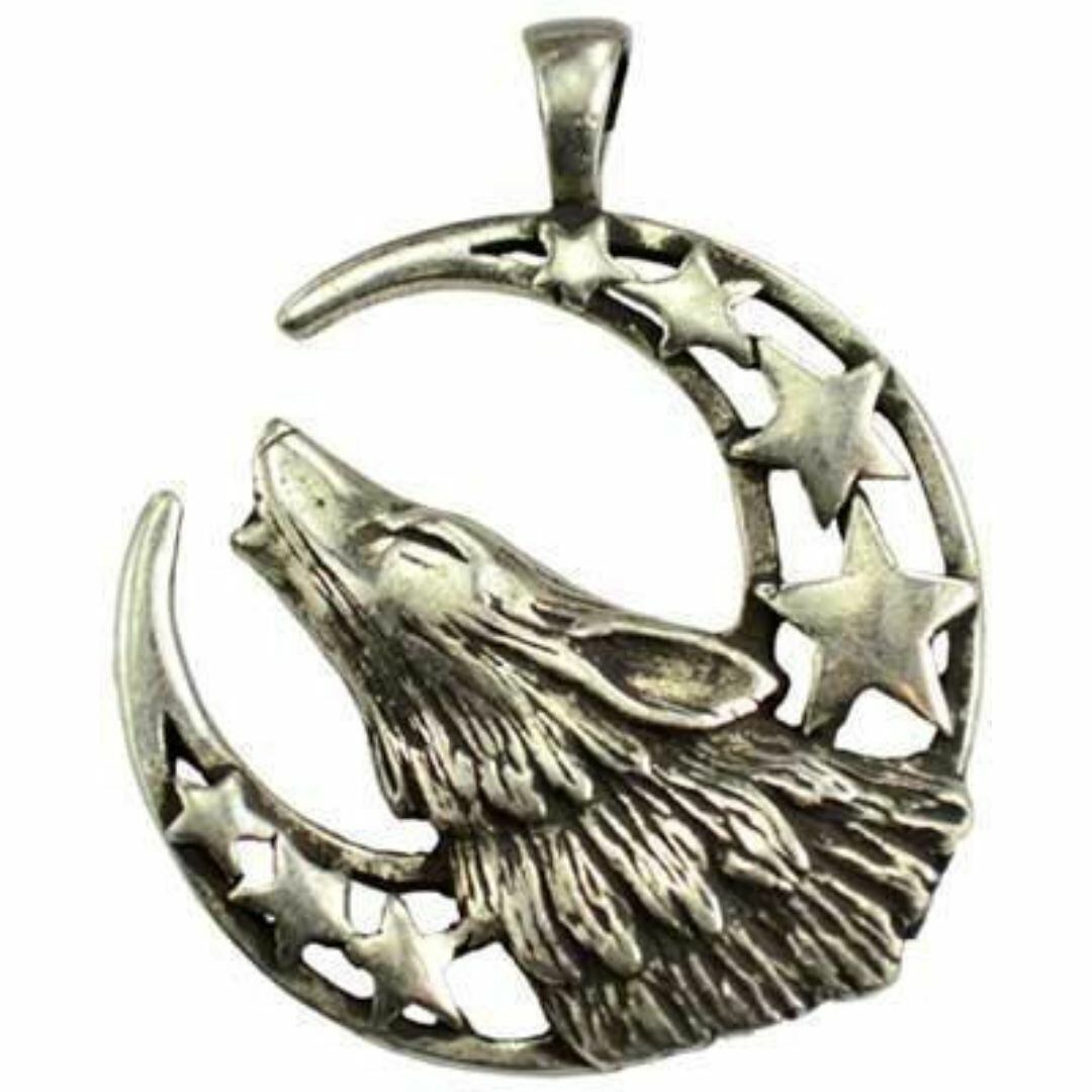 このペンダントは、三日月の月と背景に星が付いたハウリングオオカミの頭を特徴としています。
