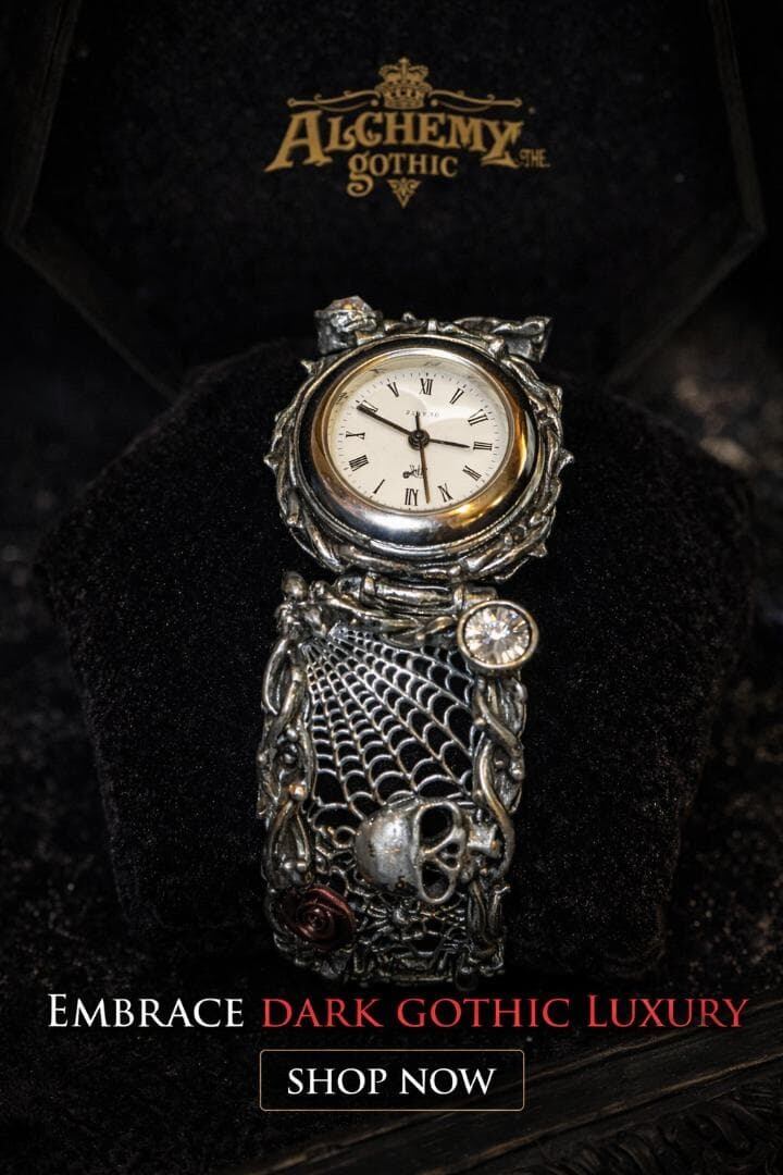 イギリスの伝説的ゴシックブランド、Alchemy Gothic(アルケミー・ゴシック)の手による、芸術的なウォッチブレスレット。モデル名「Rose Garden(ローズ・ガーデン)」が示す通り、そのデザインは美しくも毒のある秘密の花園を彷彿とさせます。