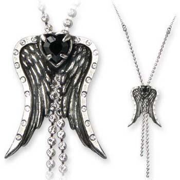 本物のスワロフスキークリスタルとカップチェーンで仕上げられた、小さな黒いハートを縁取る美しい様式化された天国の翼のペアです.古典的なゴスのモチーフを現代的に解釈し、最高級のジュエリー職人技と組み合わせました。