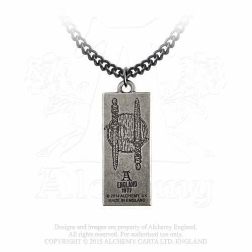 錬金術の頭死、死の頭印、黒い涙、戦士の剣は、戦いでの命の奪取を象徴しています。黒いエナメルのディテールが施されたダークピューターのインゴット、モデル化された剣、スモーキーな透明エナメルの下にカプセル化されています。黒の53cmの縁石チェーン。