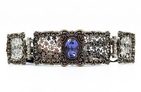 ツタの格子の中で眠っているコウモリの細かい網目模様が側面にある、挑発的な大きな紫のファセットクリスタルを表示する、豪華なバロック様式の蝶番付きの 3 パーツ フレーム。 3 つのフレームは 16.5cm x 3.2cm で、クリスタルの長さは 1.9cm です。 17.8cmのブラックサテンリボンタイ付きで、長さは43.2cmまで調節可能です。 Tzarina: ロシア帝国の「女王」。アルケミーゴシック製。