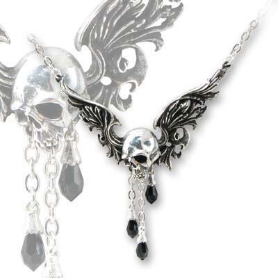 レクイエム・ヴォラティリス P575、「翼上の死」 - 死すべき運命の儚く悲しい象徴が黒曜石の涙を流す。スワロフスキー ジェット クリスタル ドロッパー付き。ペンダントはアルケミー ゴシック製、約 8 x 7 x 2cm。