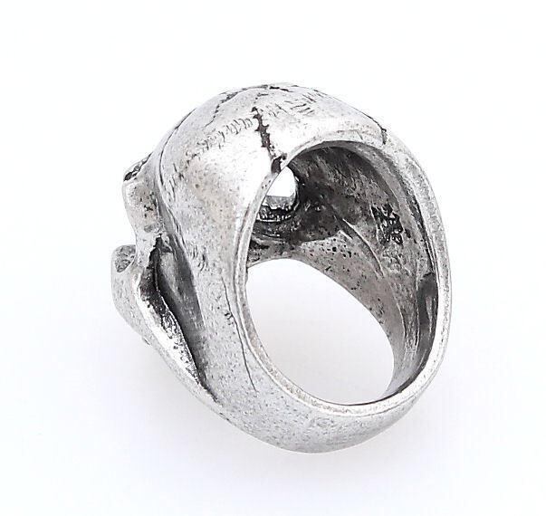 頭蓋骨のアジを悪魔のような表情に歪め、壊れた頭蓋骨の大胆かつ印象的なデザインは、一目見れば誰もが恐れおののく存在感を放ちます。また、磨かれたピューターの質感も上品さを醸し出しています。