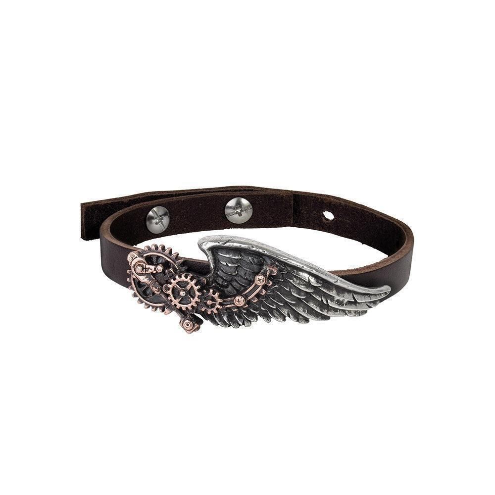 スチームパンク時代の雰囲気を感じさせるブラックバロンテクニシャンズ・ウィングストラップ。ツートーンのピューター製で、ダークブラウンのスプリットレザーストラップにブロンズとシルバーのギア駆動の翼が飾られています。ユニークでクールなデザインは、スチームパンクファンの方々におすすめです。ワンサイズで提供しており、男女問わず幅広い方々にご利用いただけます。ブレスレットの裏側にスタッドのアクセントがあり、フィット感を調整できます。