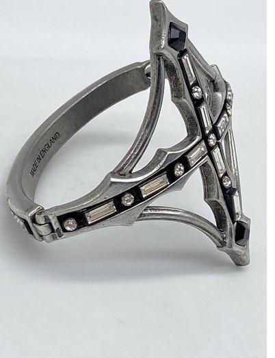 少し退廃的でありながらも贅沢な雰囲気が漂う、十字架の形をしたブレスレットです。クリスタルが散りばめられており、手首に装着するだけで存在感を放ちます。このブレスレットは、英国で手作りされたピューター合金で作られており、品質にもこだわっています。さらに、スワロフスキークリスタルを使用しており、輝きや美しさを引き立てています。