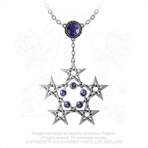 超自然的で魔法のお守りの中で最も強力な、五芒星の五芒星。各ポイントにさらに五芒星があり、5 の値に力を与えられ、神秘的に認定された紫色のクリスタルがセットされています。巨大なピューターの五芒星の各点が小さな五芒星と絡み合い、雪の結晶のような幾何学的形状を作り出しています。紫色のスワロフスキー クリスタルが 5 個はめ込まれ、ペンダントは透明な紫色のエナメルの下に刻印された五芒星のディスクから吊り下げられています。追加の 3.8cm エクステンダー チェーンを備えた 45cm トレース チェーン。