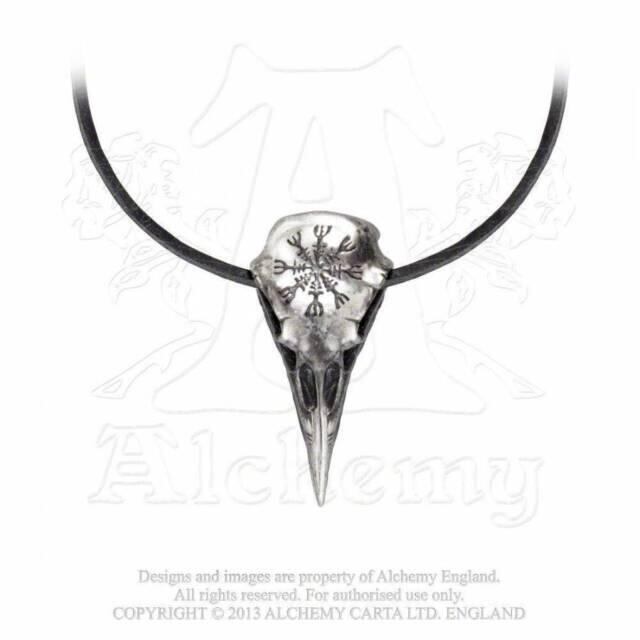 Alchemy Metal-Wear の Helm of Awe Ravenskull ペンダント P687。このワタリガラスの頭蓋骨の頭には、アイスランドの五線記号「Aegishjalmur」または「畏敬の念の兜」が刻まれており、着用者に強大な力を吹き込み、敵の心に恐怖を植え付けます。