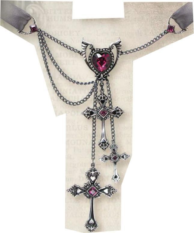 悲劇的な悲しみに暮れた人への深い同情のメッセージを込めた、ALCHEMY GOTHICのティアーズ・オブ・グリーフ・チョーカー。詩的なひねりを加えたフェミニンなデザインで人目を引くアメジストクリスタルの翼ハートが、3つの異なるスワロフスキークロスのピューターペンダントと一緒に儚く揺れます。グレーサテンリボンで装飾された非対称チェーンが、エレガントな印象を与えます。15 mm グレーのサテン リボン チョーカーに非対称にチェーンされています。