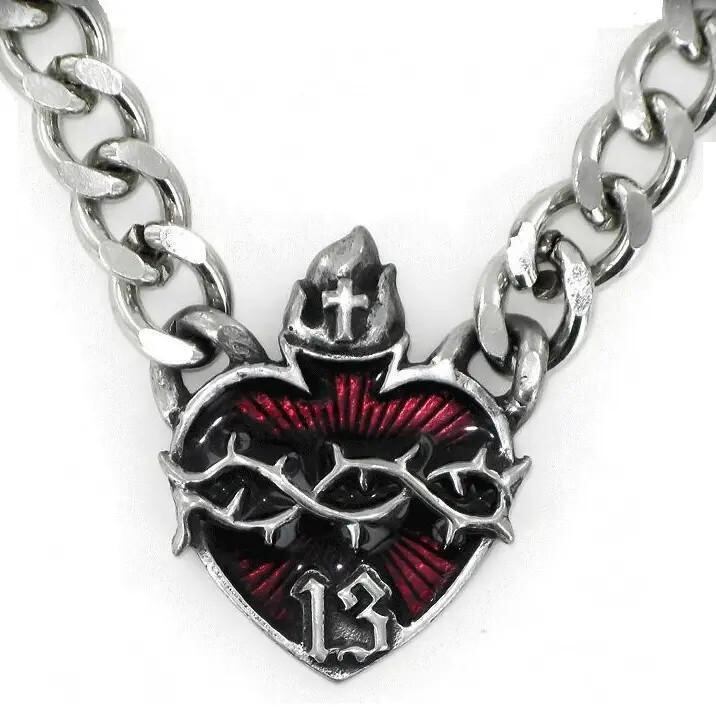 中央から放射状に光るハートは、真っ赤なエナメルと小さな十字架で飾られています。ペンダントは巨大なチェーンに取り付けられています。