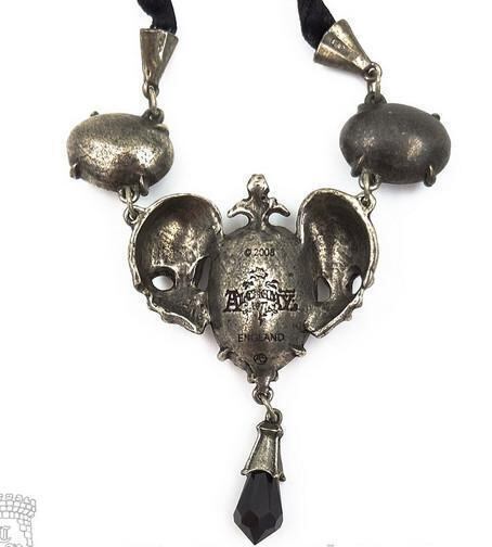 結ぶための黒いリボン、黒いリボンのネックレスに、2 つのスカルで囲まれた、横に置かれた枢機卿の透明なオーストリアのクリスタルに感情が刻まれている「愛、愛、死」。外側に 2 つの濃い赤の石。透明な石にはこう書かれています:Amour a la mort...死ぬまで愛してください。