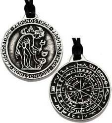 このお守りは、現在のトルコにある古代ギリシャの都市、ペルガモンで見つかった直径 12 cm のブロンズ ディスクのレプリカです。鉛フリーのピューター製です。ADIV127