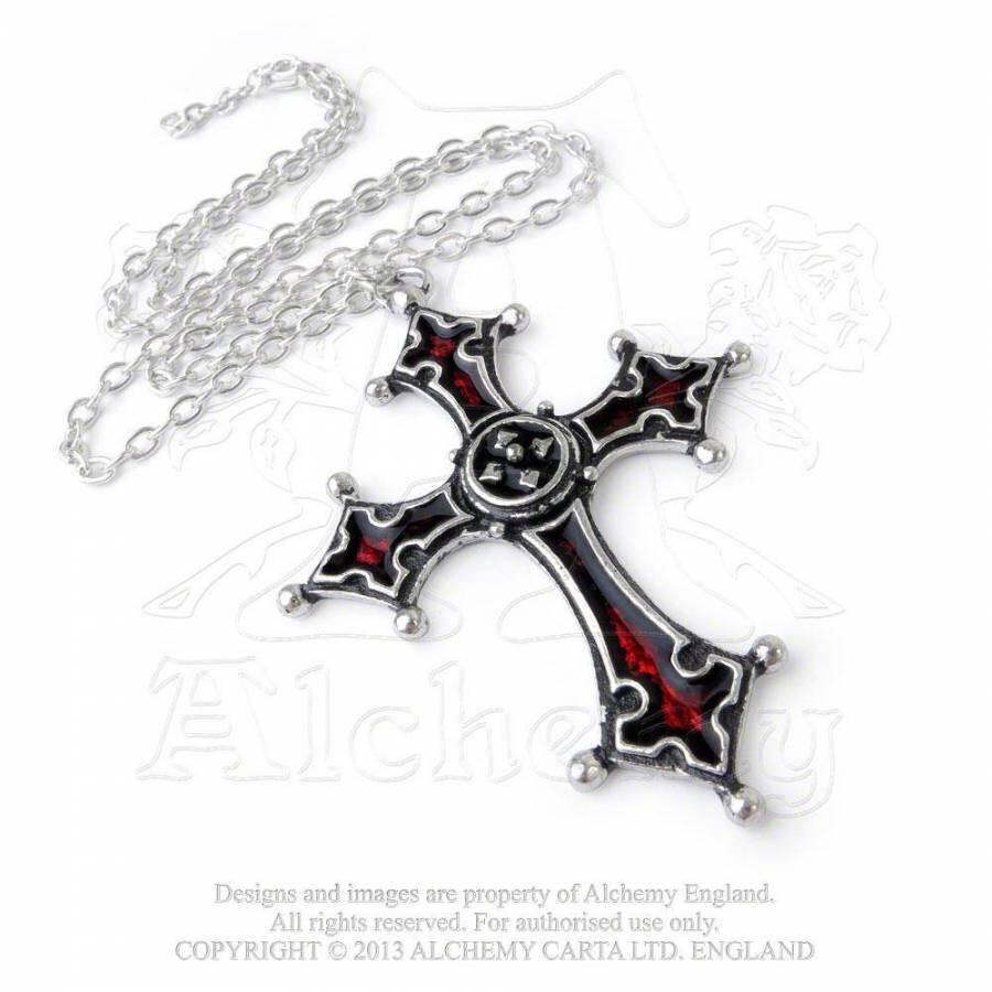 ヘモグロビンレッドとブラックのエナメルを施したクラシックなチューダーエリザベス様式のゴシックピュータークロス。吸血鬼のようなひねりを加えたクラシックなゴシックデザイン。半透明の赤とソリッドブラックのエナメルインフィルを備えたピュータークロスペンダント。