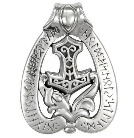 北欧神話では、トールは雷、稲妻、嵐、強さ、保護、樫の木、癒し、豊穣の神として知られています。雷を鳴らして人類を守るトールのハンマーは、ミョルニルと呼ばれています。 この描写は、トールに、それを着用する人々の家を崇拝し、保護し、神聖なものとするよう求めています。ルーン文字はフサルク長老からのもので、「マイティ・ソーの神聖にしてこの聖なる馬を保持せよ」と書かれています。