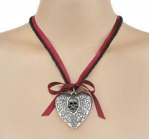 豪華な装飾が施された派手なサイズのハート ロケット。インナー ミラー、真鍮製のトップ ヒンジ、マグネット キャッチ、ユニークな 21 インチの黒いビーズと赤いリボンのネックレスが特徴です。内側には、装飾的にエッチングされた秘密の愛の詩があります。ロブスタークロウクラスプで留めます。鉛フリーの高級イングリッシュ ピューター、アルケミー ゴシックの本格的なネックレス。