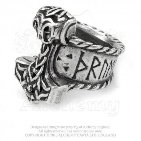 トールの象徴的なハンマーをバイキングスタイルで精巧かつ複雑に彫刻したピューターリングで、シャンクにはルーン文字が刻まれています。