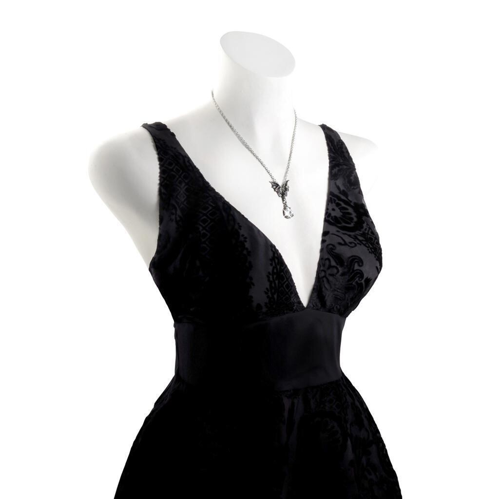 夜の翼にあるクリスタルの贅沢。褒め言葉を確実に引き付ける、可憐でエレガントなネックレス。透明なクリスタルのオーストリアのティアドロップを吊るした、翼を上げたピューターフライングバットペンダント。P600