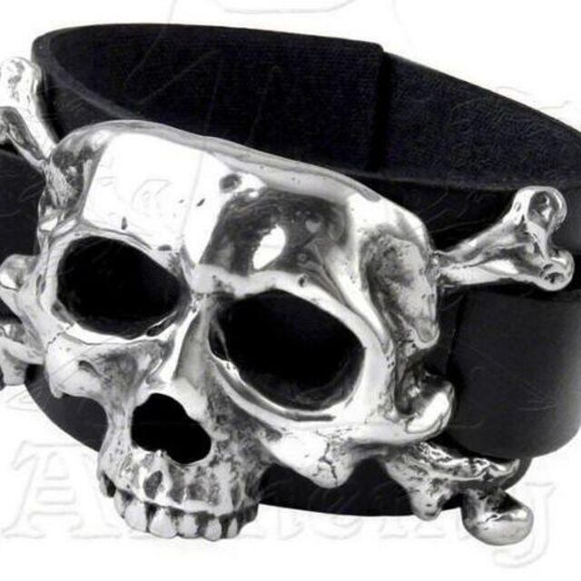 同様に原始的なアイコンを伴った、中世の葬式の句。死の顔、永遠の自己への究極のアレゴリー、そして自分自身の運命の受容。バックル留めの大きなピューターの頭蓋骨と骨のモチーフが付いた幅広のブラック レザー リスト ストラップで自分を表現する不気味なメタルウェア。