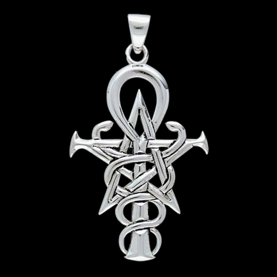 スターリングシルバーのペンダントは、3つの古代の知恵のシンボルを1つに統合しています。カドゥケウスcaduceusの癒しのシンボルと、男性と女性の力の統合。生命と全体性を表すキリスト教の十字架アンクankh cross、古代エジプトの祖先。そして、自然界の要素の調和を象徴する上向きのペンタクルpentacle古代のシンボル。