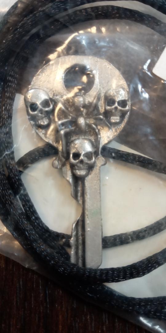 AzureGreen: キー型ペンダント センターに蜘蛛、周りに3スカル