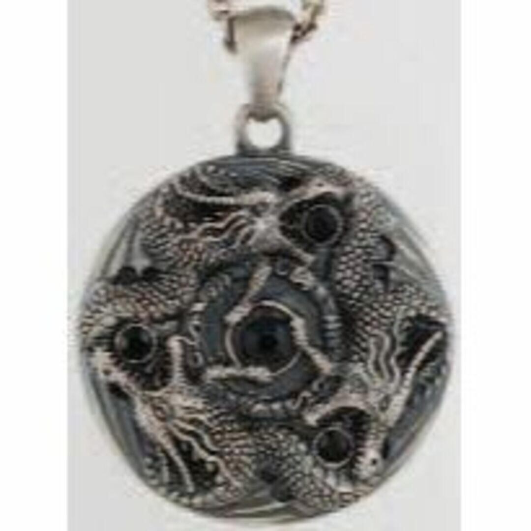 最高級の鉛フリーのピューターで精巧に作られたこの直径 1 1/2 インチの害は、3 匹のドラゴンが飛行中に互いに円を描く鮮やかな詳細なシーンが特徴です。大胆で激しいイメージで、周囲を取り囲み、スナップ口が閉じている黒い多面的な石がアクセントになっています. 23 インチのクラスプ チェーンに吊るされたこのネックレスは、ドラゴン愛好家のジュエリー コレクションに素敵な追加品となります. #JD220