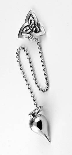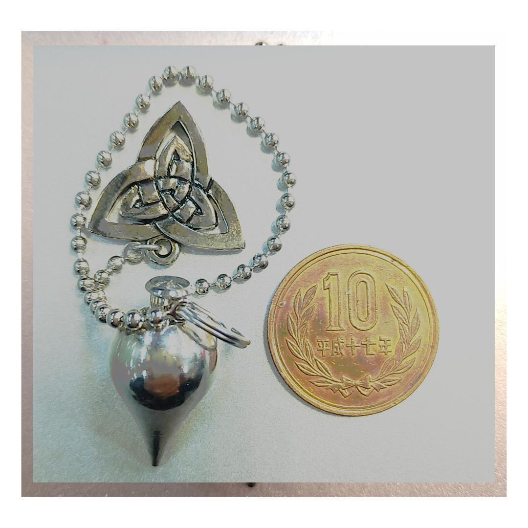 シルバー色で仕上げられたこの振り子は、長さ 5 1/2 インチの振動のないビーズ チェーンの端にある長さ 1 インチの涙滴型のボブで構成されています。チェーンは次のように終了します。